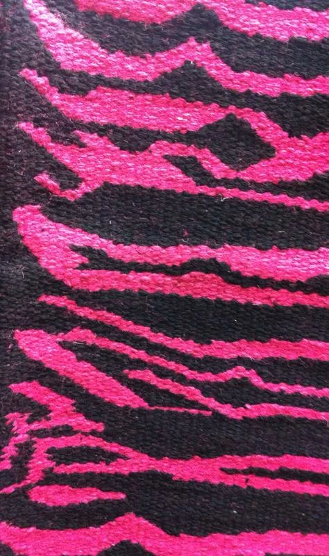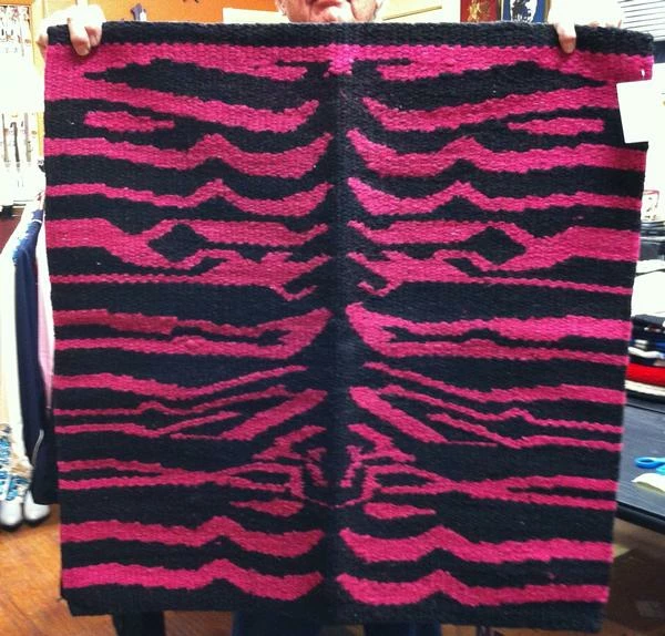 OutWest’s Purveyor, Jim Bell, holds this Zebra print saddle blanket of bright pink and black pattern, woven of wool.
