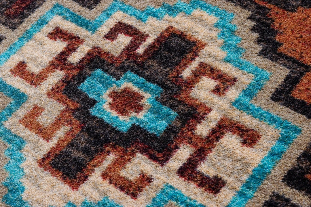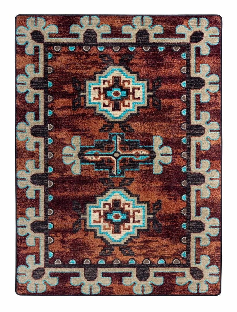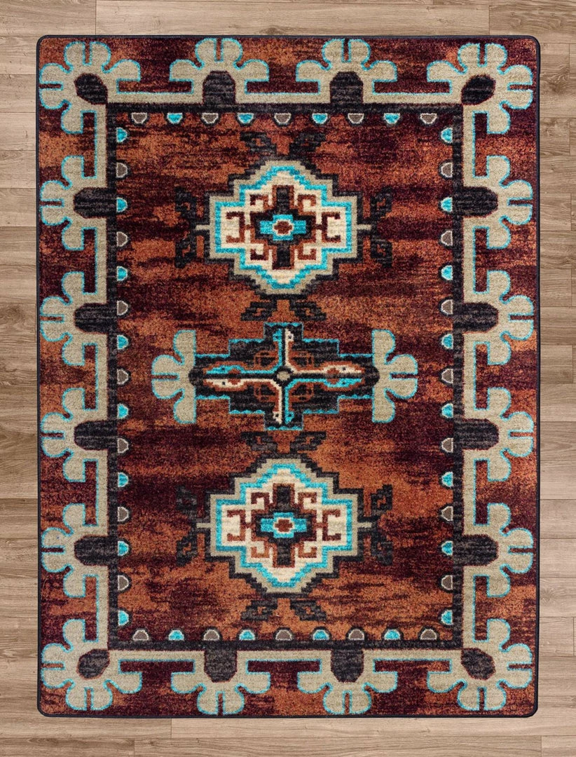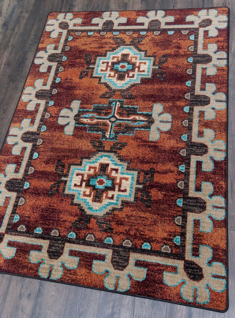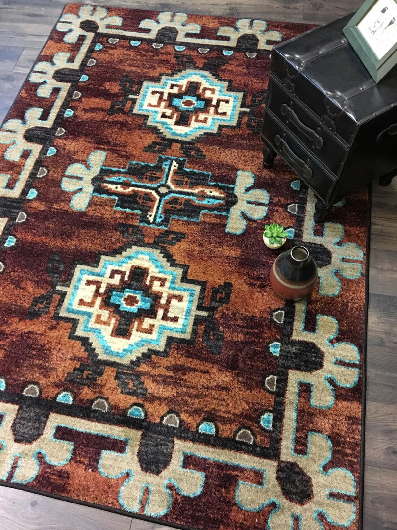 Badlands, Rust is a vintage rug pattern with a slight Southwest vibe. Create a statement in any room! Not just for floors – use on stage, in your truck bed, hang on wall or over railing. Offered in 6 sizes, made in the USA.