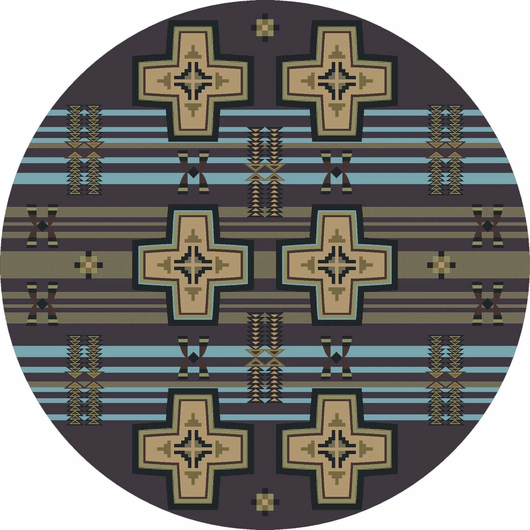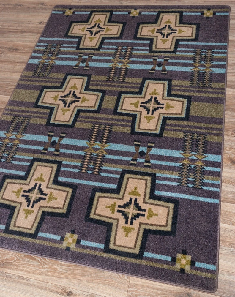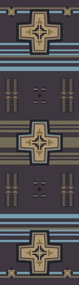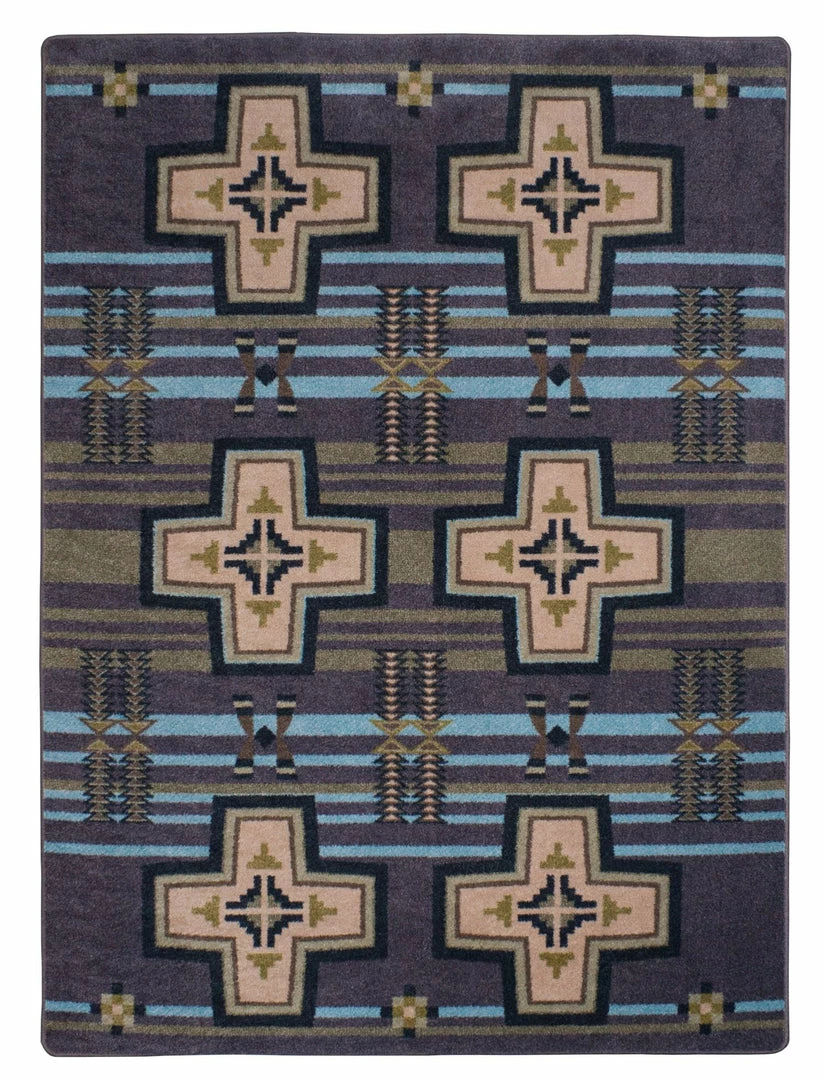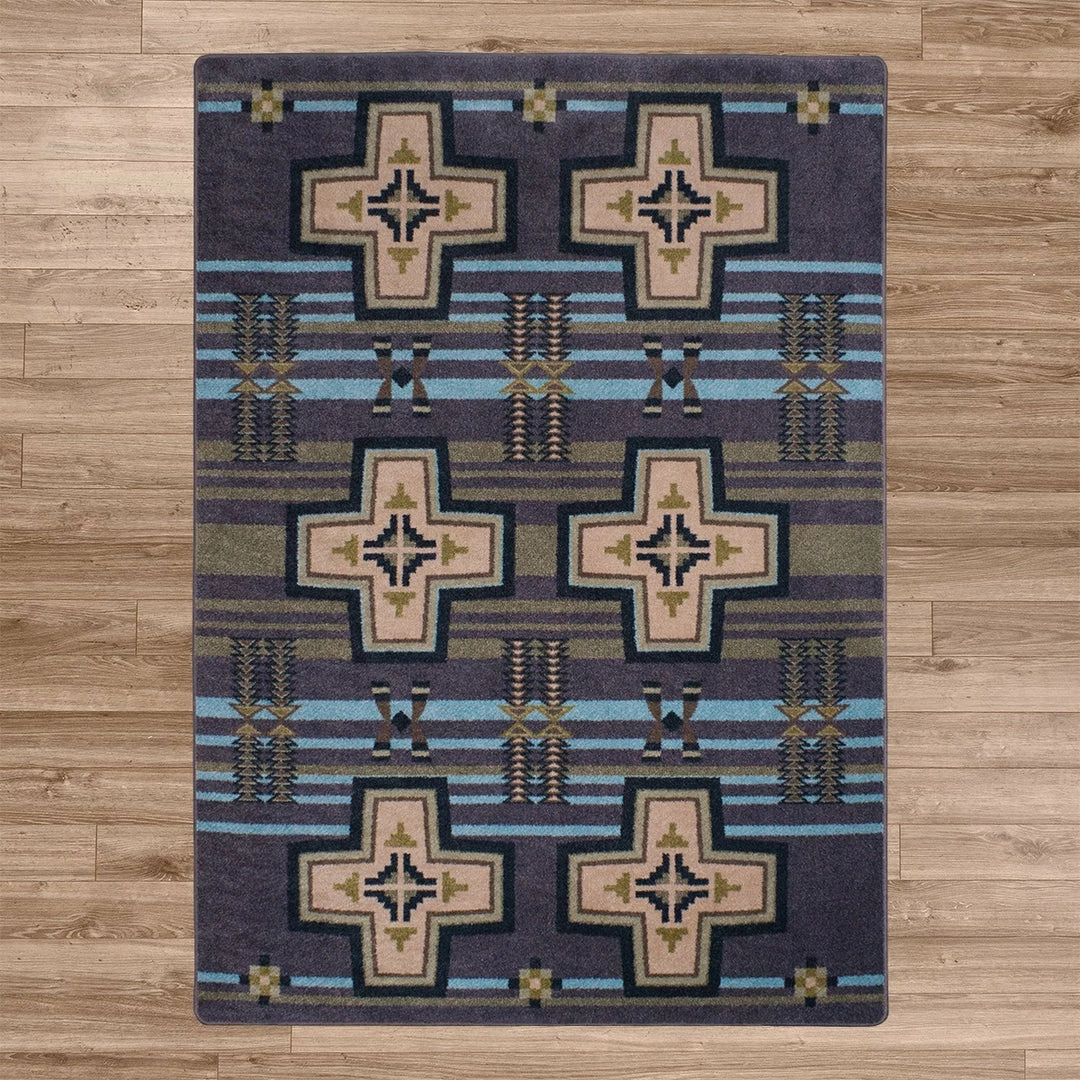 Grand River, Night Sky. Bold crosses and stripes set against striking colors bring this rug to the forefront of any room. Not just for floors – use on stage, in your truck bed, hang on wall or over railing. Offered in 6 sizes, made in the USA.