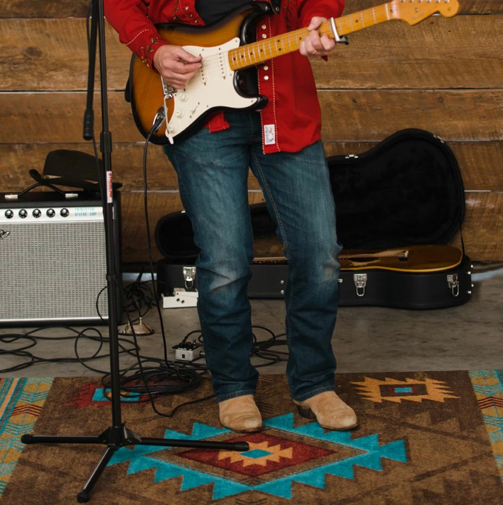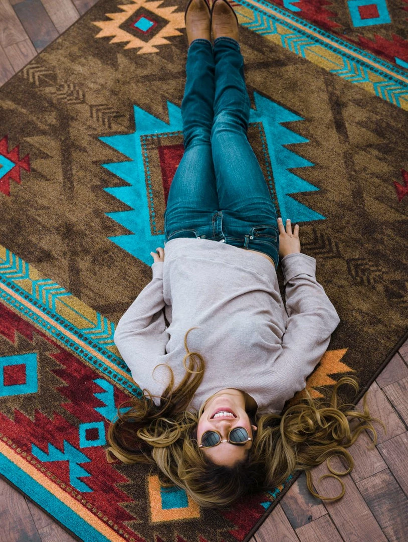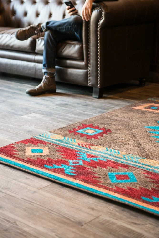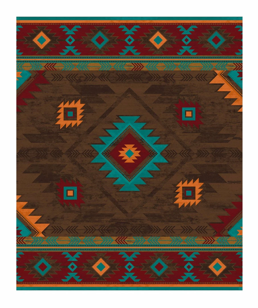 WHISKEY RIVER TURQUOISE design is rich and inviting. Bring in the colors of the southwest with this rustic-themed area rug. Great for the home, office, on stage, or cabin hideaway! Not just for floors – hang on wall or over railing. Offered in 6 sizes, made in the USA.
