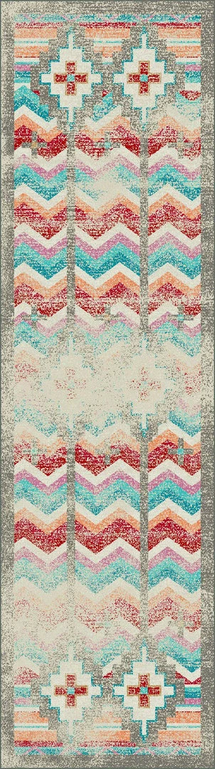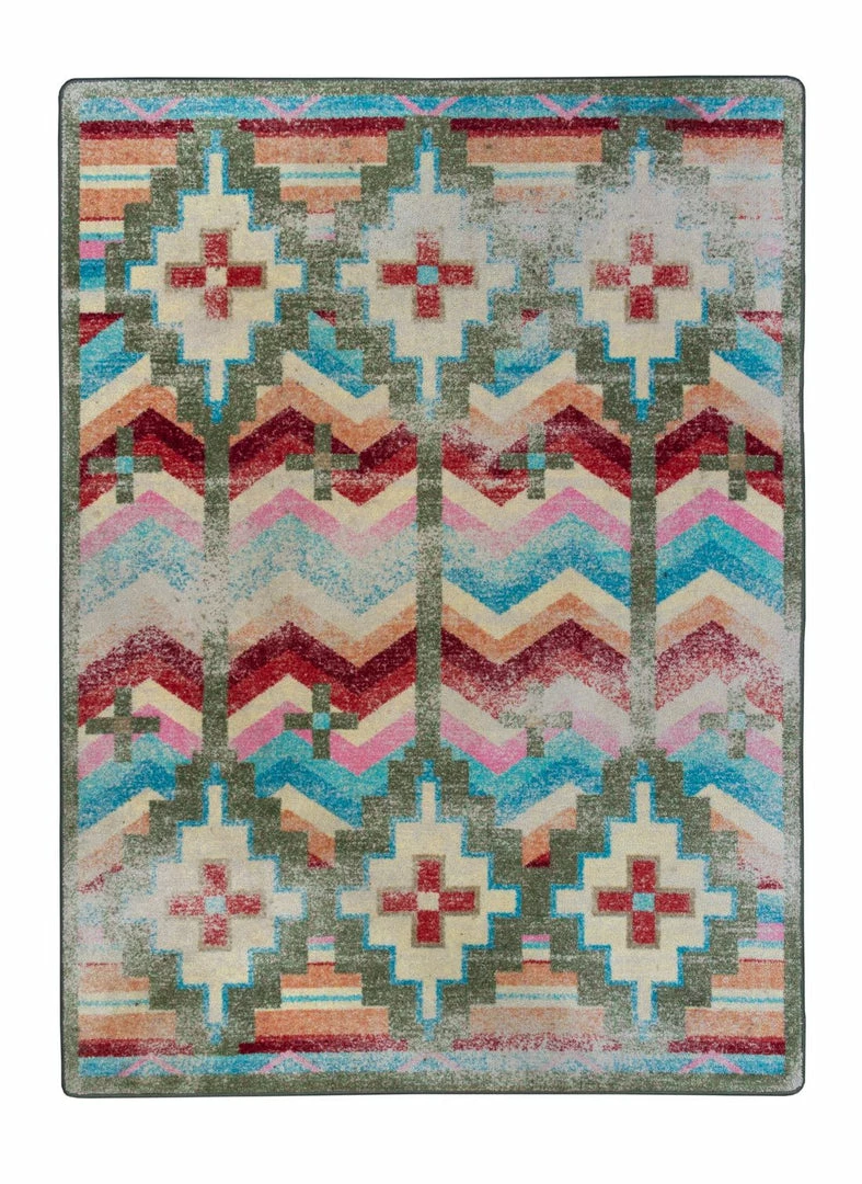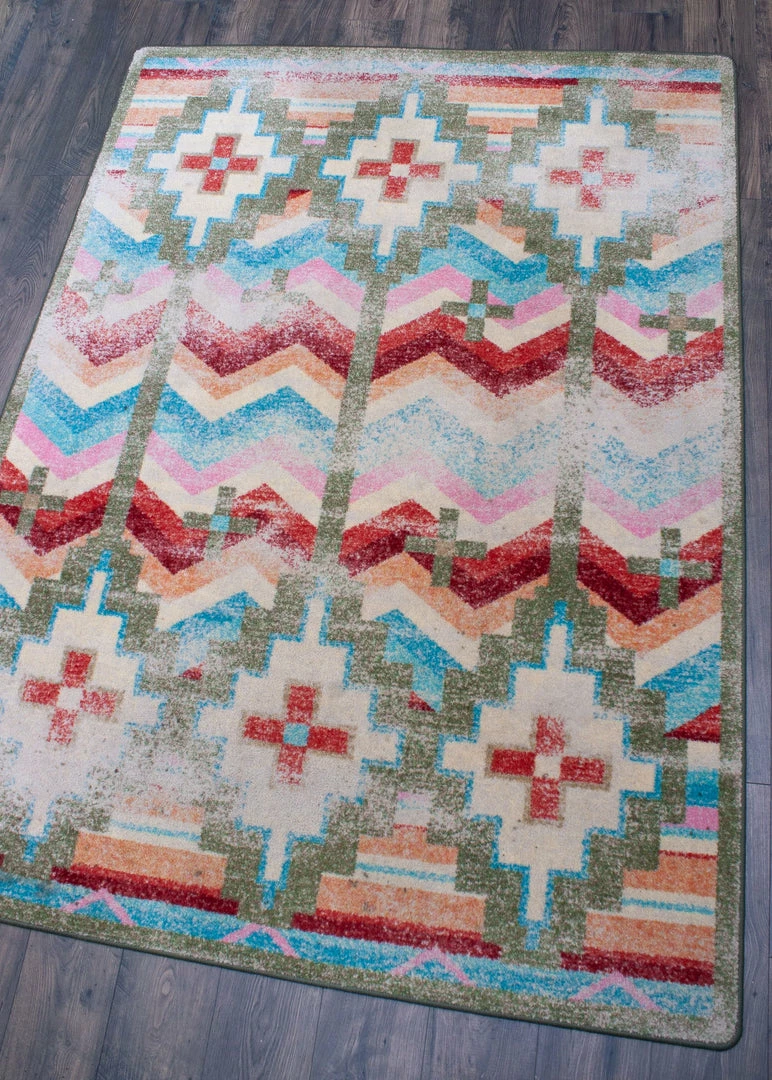 Shake Your Shawl, Bright Distressed The colors in this rug are inspired by brightly colored contemporary shawls. Not just for floors – use on stage, in your truck bed, hang on wall or over railing. Offered in 6 sizes, made in the USA.