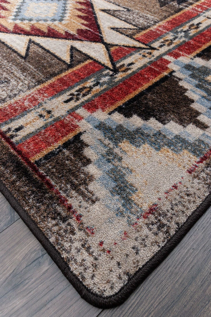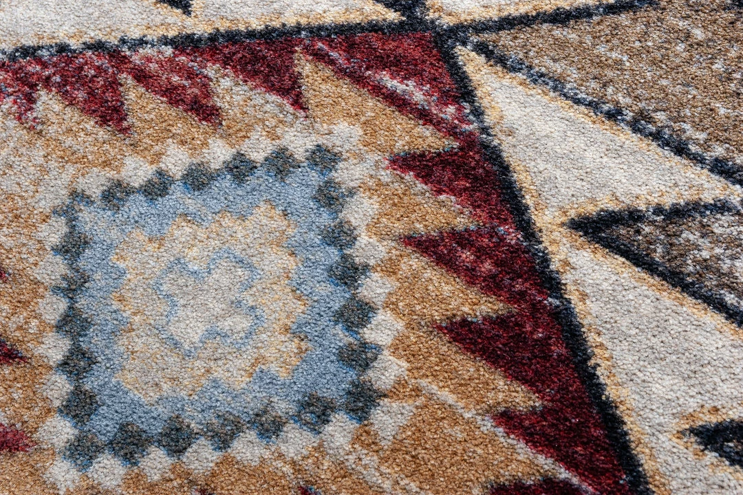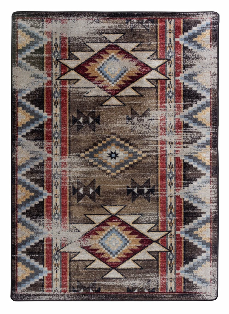 BOW STRINGS DISTRESSED design is contemporary and inviting. A Southwest treasure, this geometric pattern will bring true rustic charm to your humble abode. Bring in the colors of the southwest with this rustic-themed distressed area rug. Great for the home, office, on stage, or cabin hideaway! Not just for floors – hang on wall or over railing. Offered in 6 sizes, made in the USA.