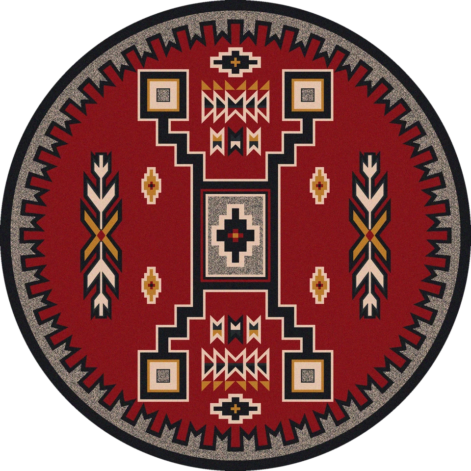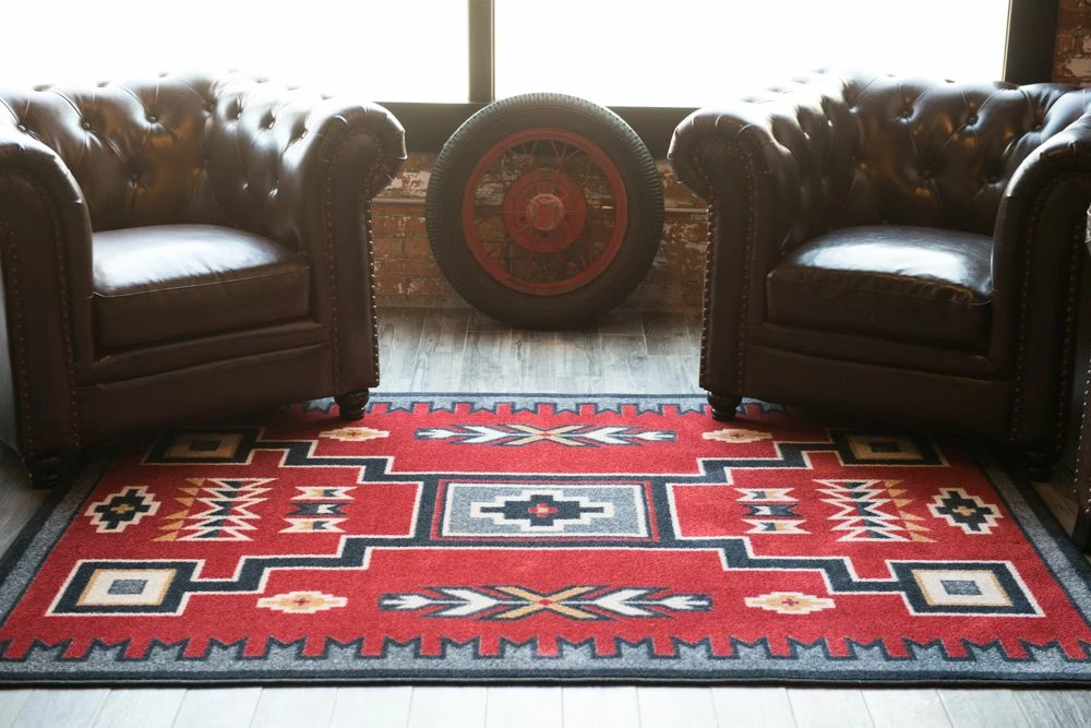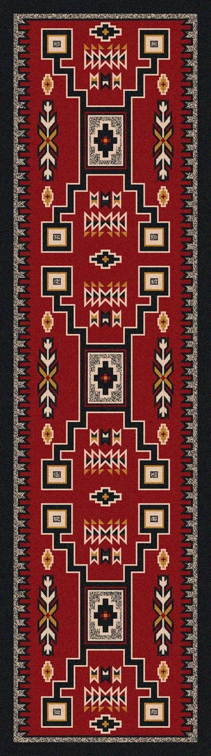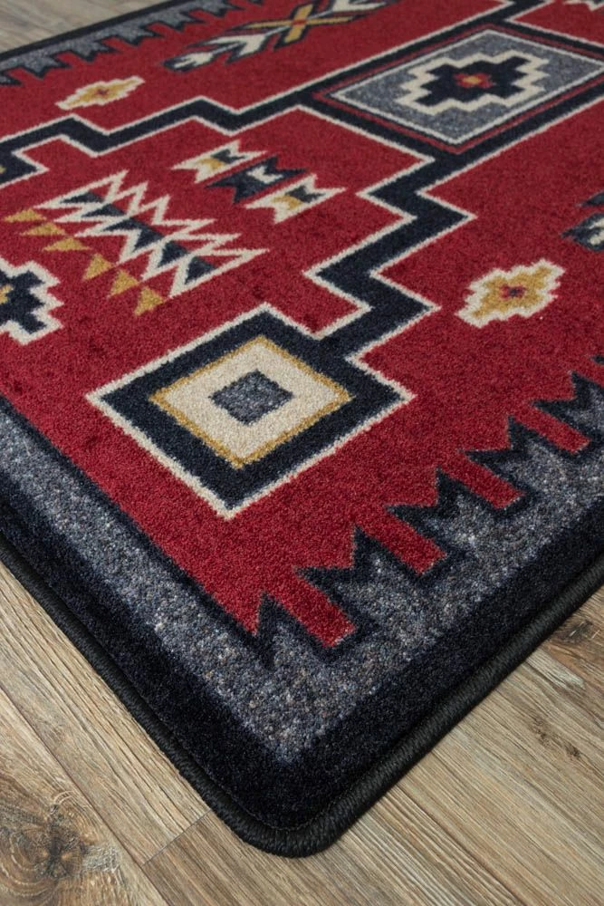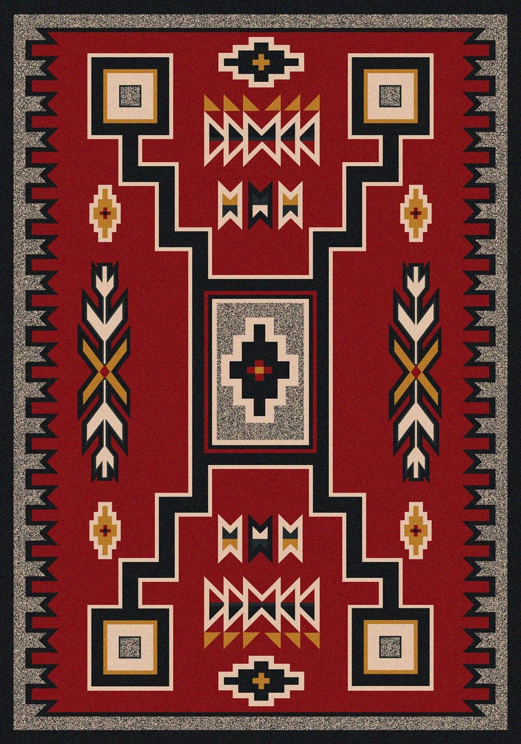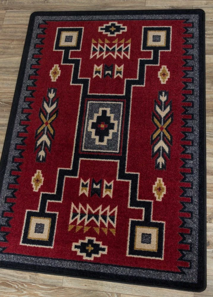 OLD CROW RED traditional pattern will serve as the final layer to your home décor, rich and inviting. Bring in the colors of the southwest with this rustic-themed area rug. Great for the home, office, on stage, or cabin hideaway! Not just for floors – hang on wall or over railing. Offered in 7 sizes, made in the USA.