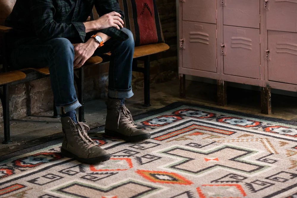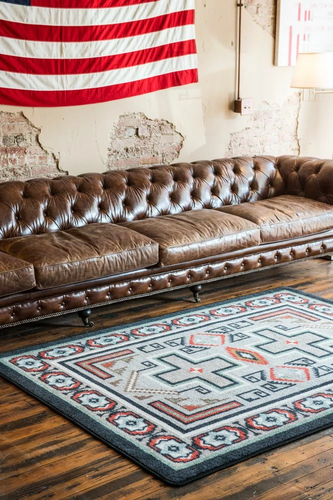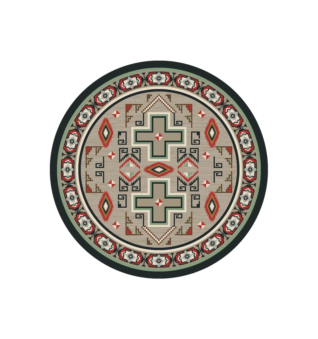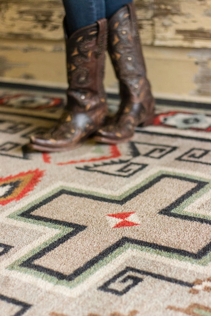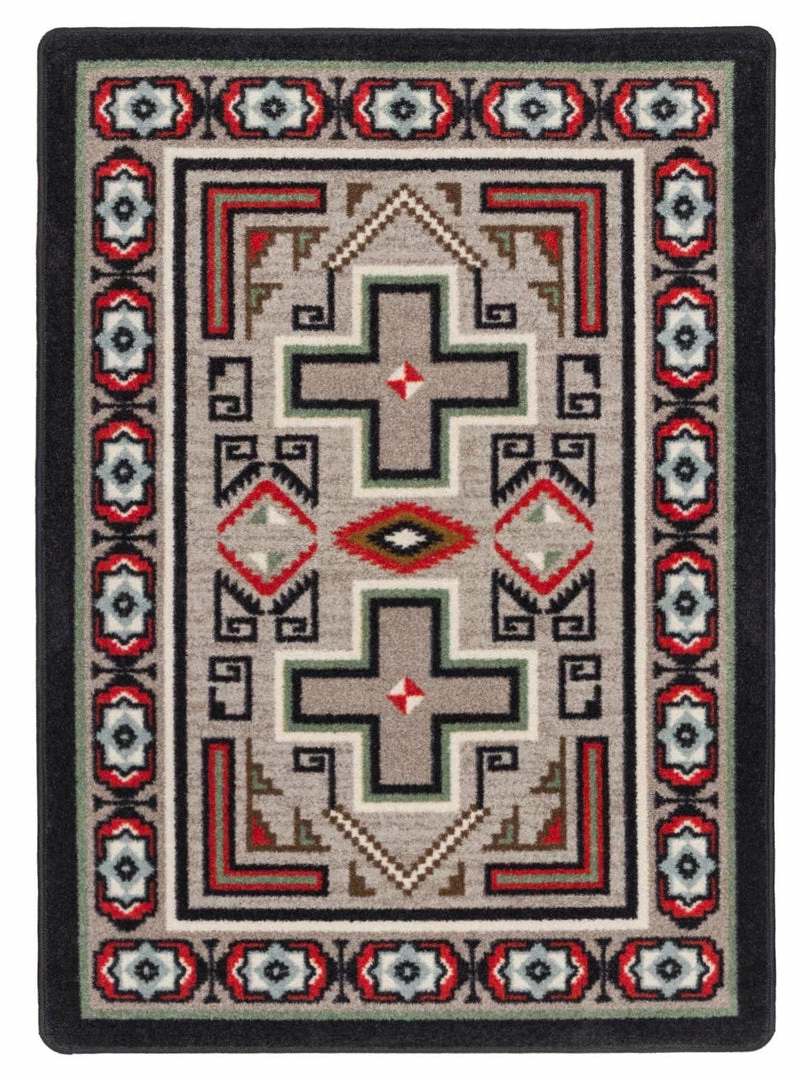 SAW TOOTH This beautiful design features ornate details and subtle hints of Green, White, and Red across a light background. Bring in the colors of the southwest with this rustic-themed area rug. Great for the home, office, on stage, or cabin hideaway! Not just for floors – hang on wall or over railing. Offered in 6 sizes, made in the USA.