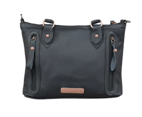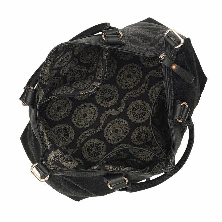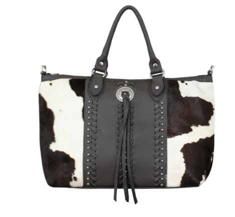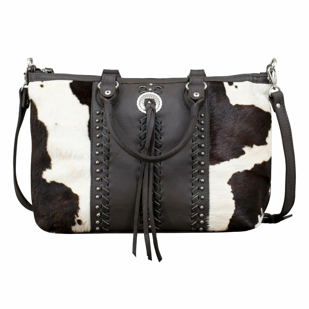 Cow Town Collection: Free and easy styling is just part of this roomy Satchels’ irresistible charm. Created in soft, tumbled genuine leathers and trimmed with genuine hair-on cowhide, these totes will create a striking accent to any outfit. Leather lacing, antiqued spots, and a decorative concho with bolo-style tassels add an extra touch of class. Each handbag features a back slip pocket, cotton lining, an interior zip pocket, interior accessory pouches, and also includes a protective storage bag.