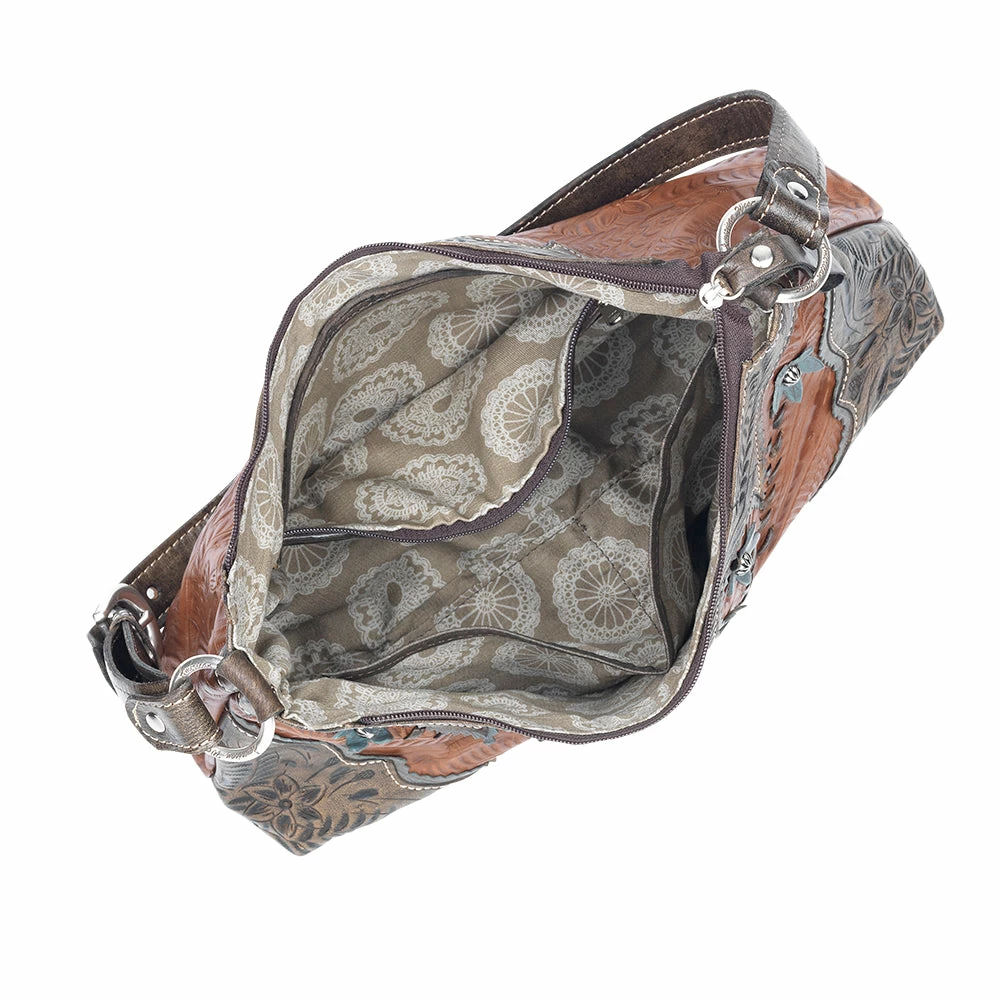 - Hand tooled on front and back of vegetable tanned genuine leather with charcoal brown leather trim, hand rubbed for a unique finish-choose from 2 colors: