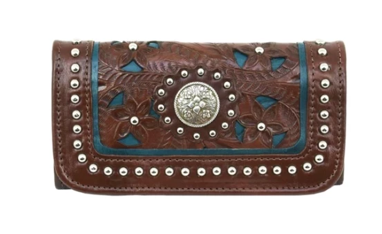 Lady Lace Collection Tri-fold wallet with snap closure. Hand-tooled vegetable tanned Light Brown or Dark Brown genuine leather with Turquoise leather inlay accents and silver spot designs, featuring a floral silver concho. Full leather inside contains a flap for a checkbook, 13 card slots, and 5 compartments. Back has a zipper coin pocket. Each piece is made by hand, one at a time.