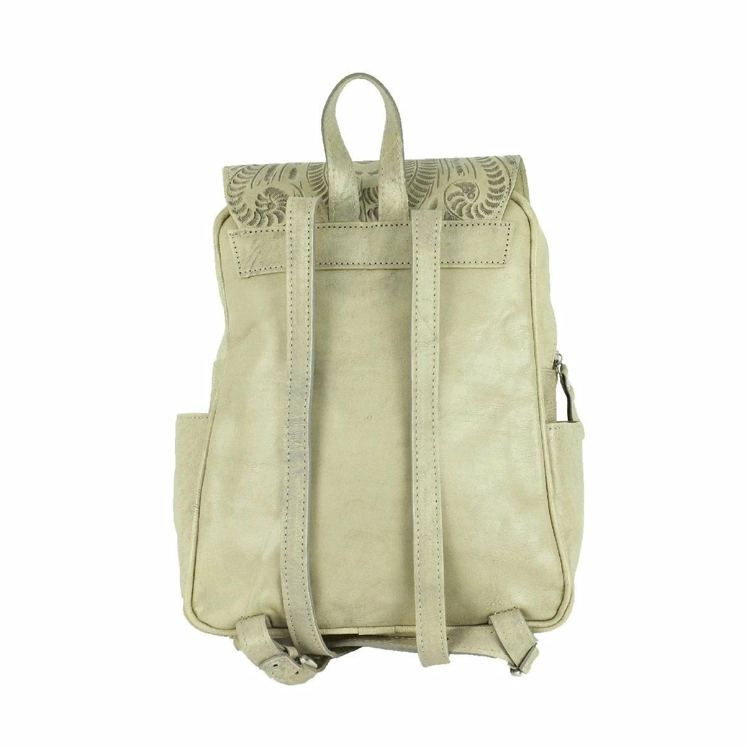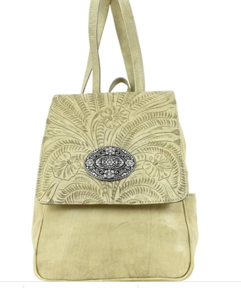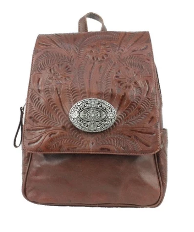 Lariats & Lace Collection: Single compartment backpack with side pockets. Hand tooled genuine leather. Inside is one compartment with zipper and open pouches on sides. There is a zippered pocket on front – under the flap. Handsome decorative concho on flap.