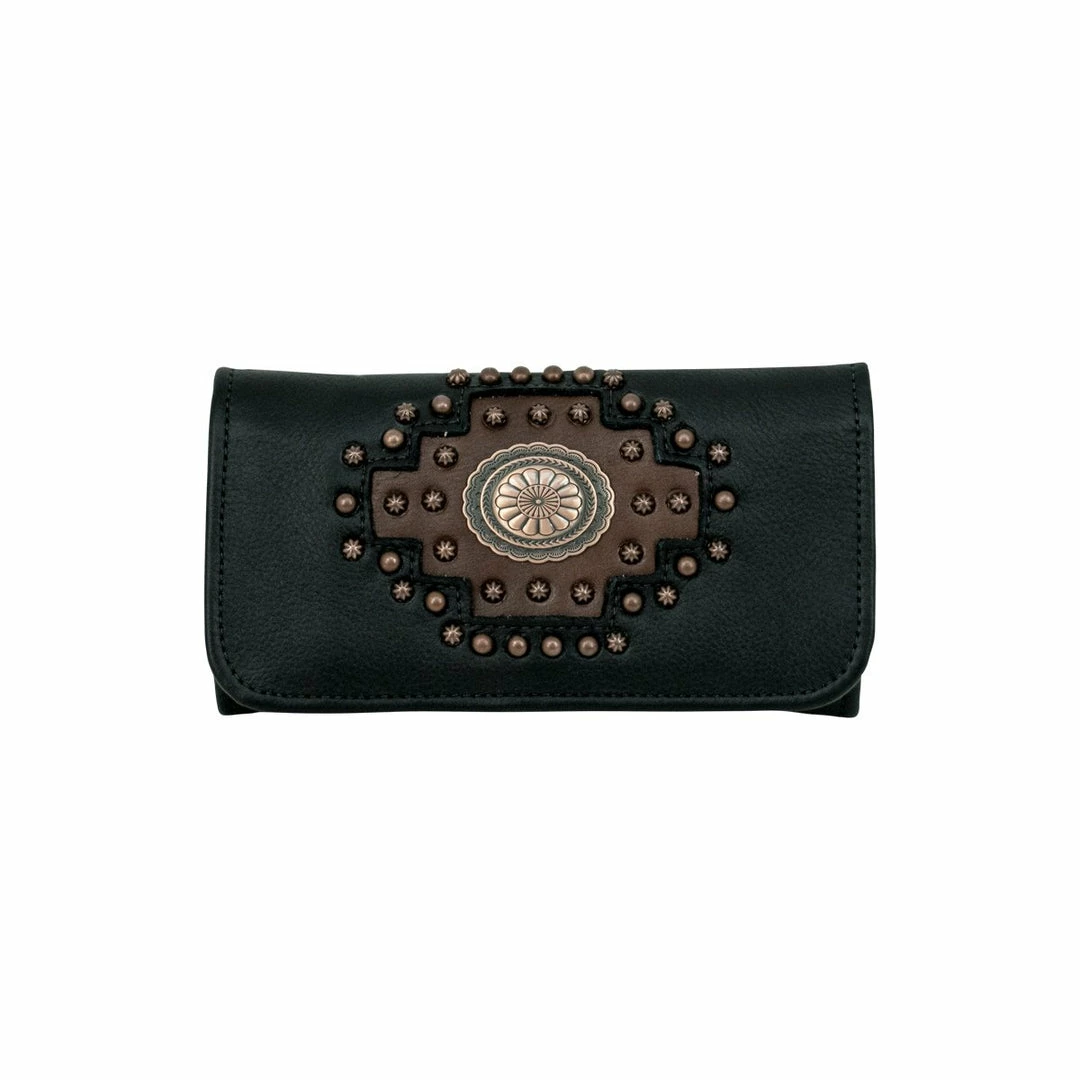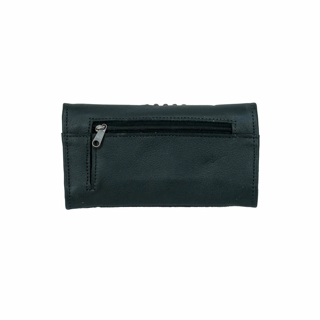 The popular tri-fold wallets feature hand tooled designs, eye catching conchos, and an exterior zipper coin pocket. The full leather interior includes 12 credit card spaces, 1 clear ID space, multiple currency pockets, and a checkbook flap.