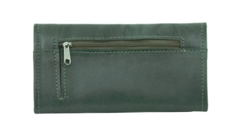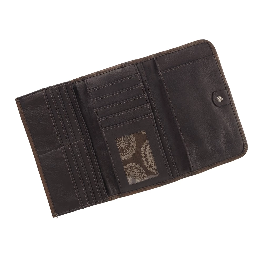 The popular tri-fold wallets feature hand tooled designs, eye-catching conchos, and an exterior zipper coin pocket. The full leather interior includes 12 credit card spaces, 1 clear ID space, multiple currency pockets, and a checkbook flap. Available in 2 colors: Distressed Charcoal (Brown), Marine Turquoise.