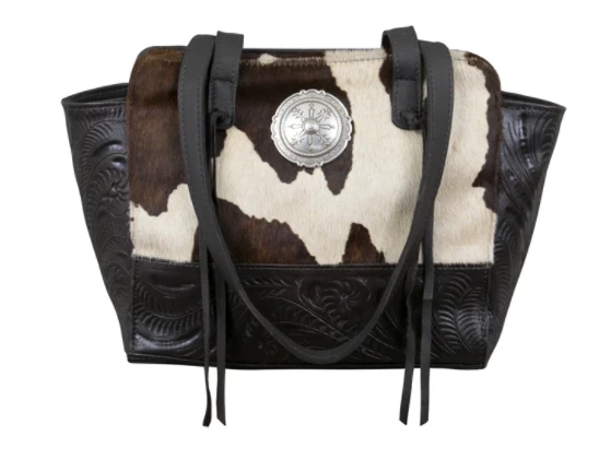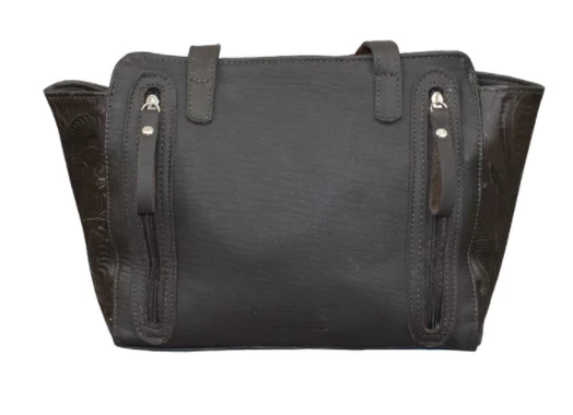 Pendleton Pony Collection Zip Top bucket tote with hidden back wall compartment. Hand tooled vegetable tanned genuine leather is accented with a silver tone concho to complete the classic western look. Hidden back wall compartment has zipper openings on either side on the bag, and is lined in genuine chrome leather (pocket will fit gun of overall length 7″ and overall height 6″). Inside has a zipper compartment and open pouches. Each handbag includes a protective storage bag. Each piece is made by hand, one at a time.