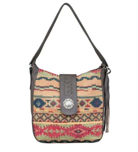 Southwest Tapestry Collection: Slouch zip top shoulder bag. Buttery soft chrome leather is accented with woven tapestry, featuring a floral silver concho. Each bag includes a protective storage bag. Each piece is made by hand, one at a time.