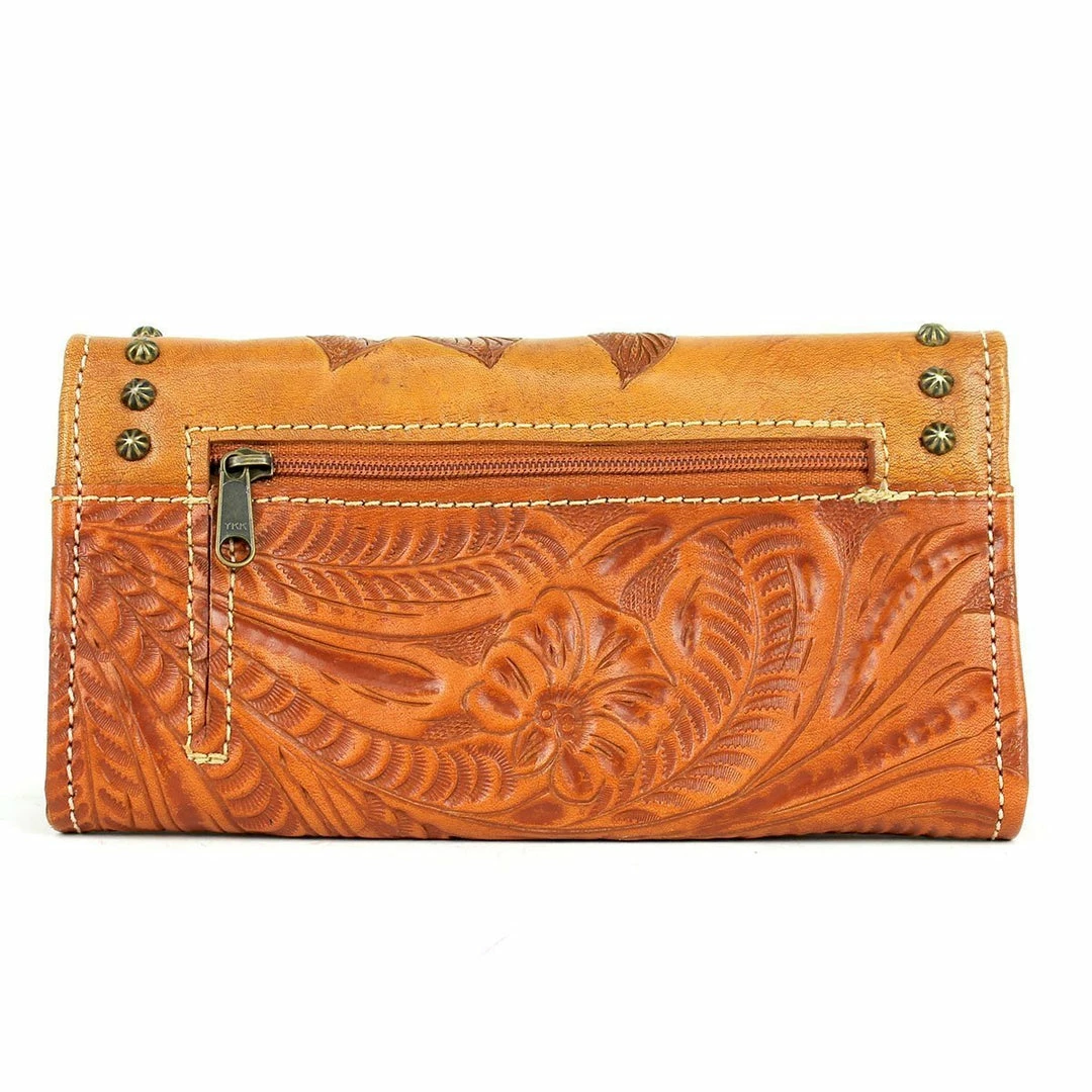 Texas Rose Collection: This popular tri-fold wallet features hand tooled design, brass studs, and an exterior zipper coin pocket. The full leather interior includes 12 credit card spaces, 1 clear ID space, multiple currency pockets, and a checkbook flap. Handmade.