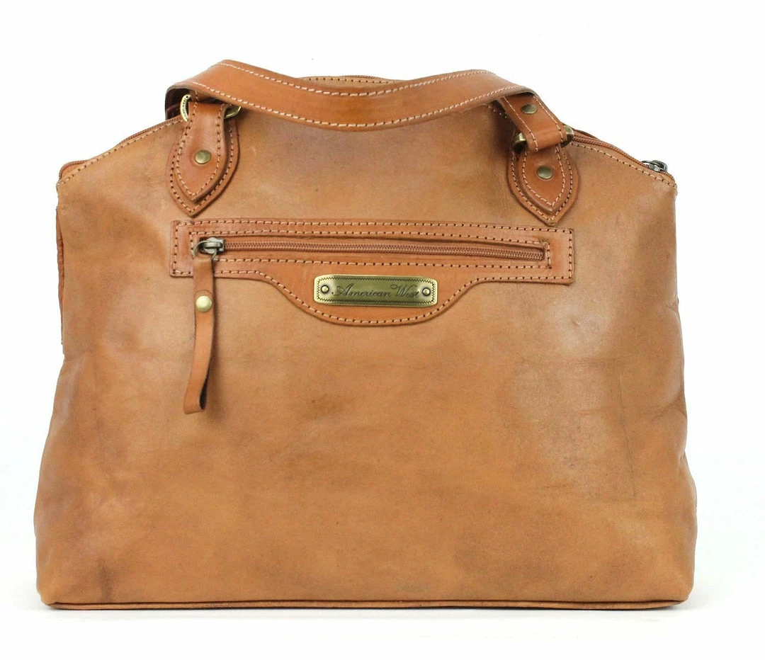 Texas Rose Collection: Hand-tooled genuine leather zip top tote featuring rose designs, a brass concho, brass spots with bolo style tassels. Smooth leather back. Interior is one large open compartment with slip pockets and a zippered interior pocket.