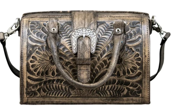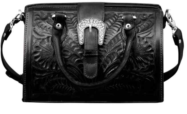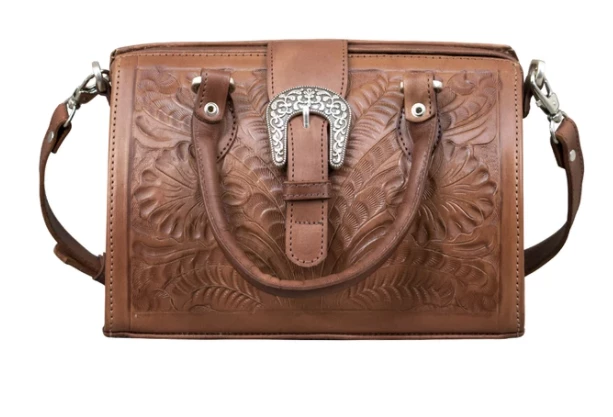 Tooled Collection: Reminiscent of another time, this Classic Doctor’s style bag is a beloved classic for American West. A single compartment with two interior side pockets is revealed when opening the hinged frame. Short carry-handles as well as a detachable, adjustable shoulder strap make carrying this treasure easy and flexible. Hand tooled vegetable tanned genuine leather accented with a decorative buckle with magnetic snap under the flap. Hand tooled on the front, sides and back. Each handbag includes a protective storage bag. Each piece is made by hand, one at a time.