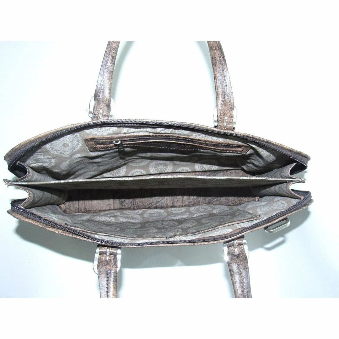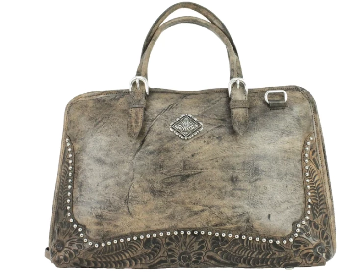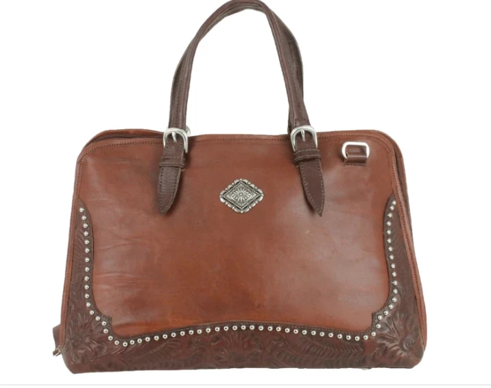 Retro Travel Collection: Zip-around “Smart” briefcase with back open pocket. Genuine leather is accented with hand tooled designs. Inside is a divided compartment making it easy to stay organized. Zippered compartment and open pouches on the side. Comes with an adjustable shoulder strap. 16 x 11.5 x 3.5″ Handle: 6″ drop; Adjustable / removable shoulder strap: 21-25″ drop. Each handbag includes a protective storage bag. Each piece is made by hand, one at a time.