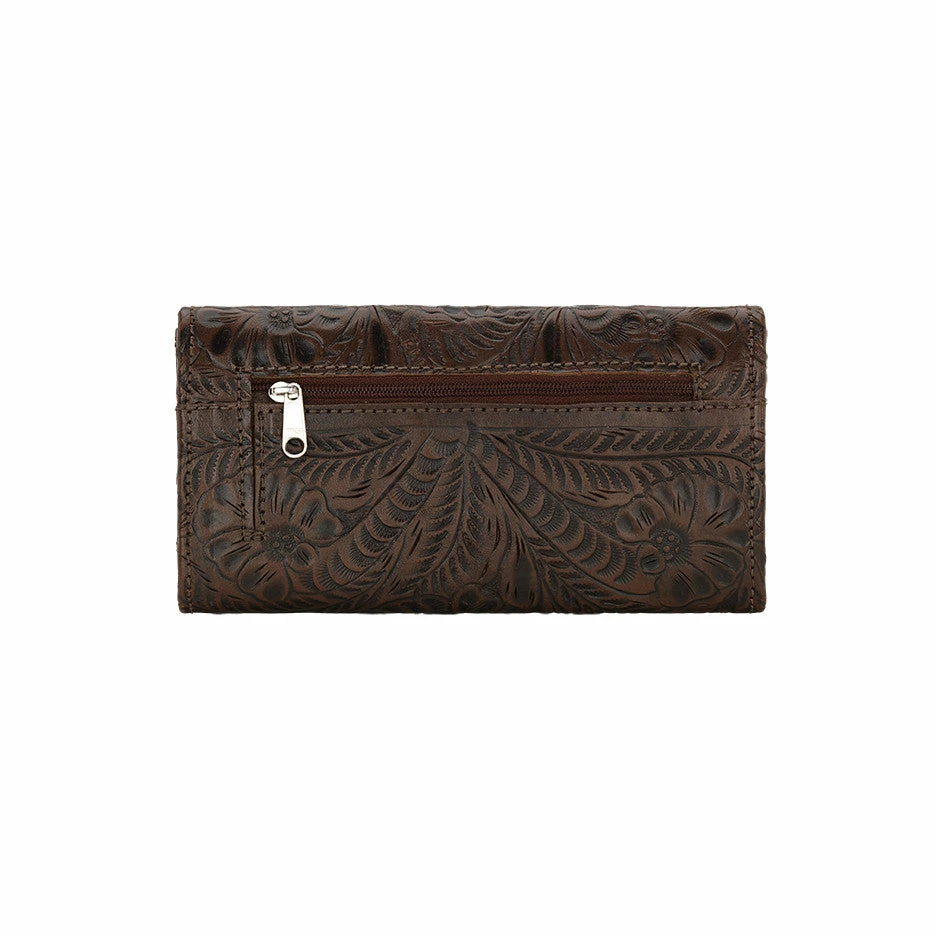 Annie’s Secret Collection: These tri-fold wallets are perfect partners to the matching Annie’s Secret handbags and totes. Hand-tooled and hand stained genuine leather. The popular tri-fold wallets include a back zipper coin pocket, and the full leather interior includes 12 credit card spaces, 1 clear ID space, multiple currency pockets, and a checkbook flap.