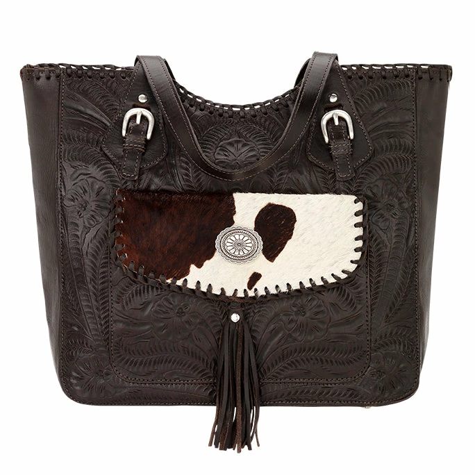 Chocolate with Pony Hair, Distressed Chocolate Brown and Black Hair, Chestnut Brown and Brindle Hair - Hair on Cowhide flap pocket with tassel