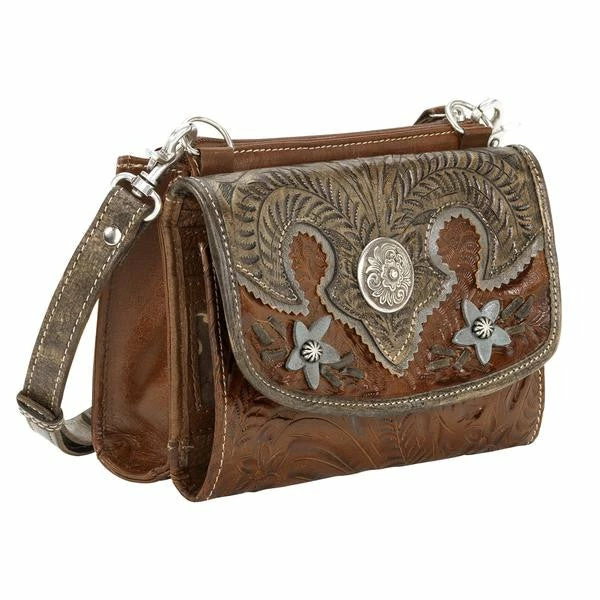 Desert Wildflower Collection: Hand tooling, hand lacing, flower appliques, Western yoke patterns, and striking silver hardware blend beautifully in a symphony of colors and textures to create the Desert Wildflower Collection. Made to match any casual element in your wardrobe, this collection is sure to be an everyday favorite. Each handbag is tooled front and back. The American West signature cotton lining, an interior zip pocket, interior accessory pouches and incudes a protective storage bag for all handbags.