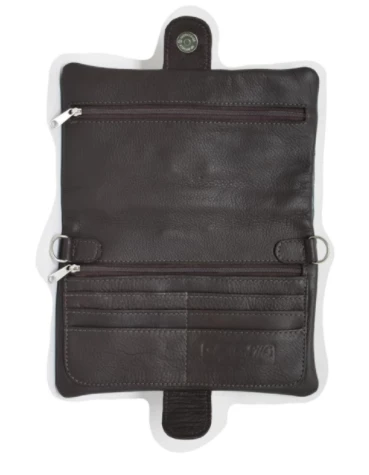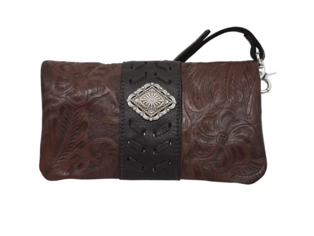 Grab-and-Go Foldover Crossbody Collection: Clutch bag…? Small purse…? Oversized wallet…? This crossbody bag is so versatile, you can decide! The inside contains a zipper pocket for your cell phone, as well as a zipper pocket for cash and coins. With 6 credit card spaces, and a large bill space, this little bag is deceivingly big! The back has yet another zipper compartment for even more odds and ends. All of this with a magnetic closure on a tab, and an adjustable, removable shoulder strap. Hand-stained and hand-tooled.