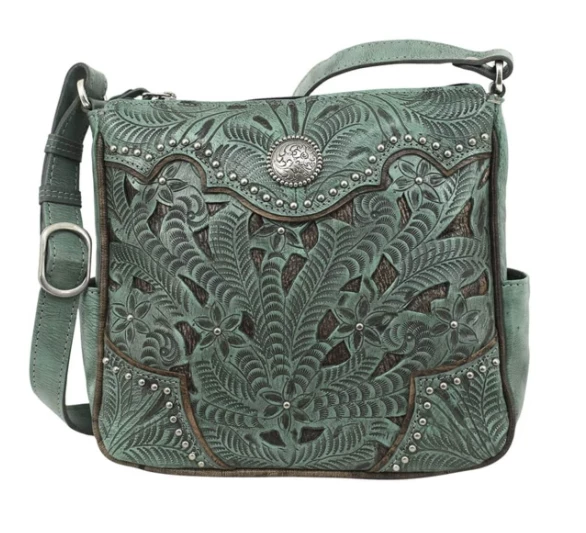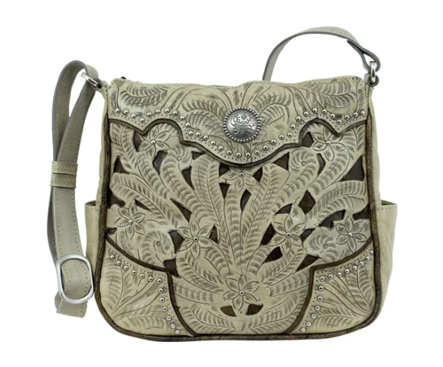 All access zip-top crossbody bag with adjustable shoulder strap. Hand-tooled vegetable tanned genuine leather, accented with leather inlays and a silver concho. Back is smooth leather. 2 side open pockets, and a back slip pocket with magnetic closure. Inside has a zipper compartment and open pouches. Each handbag includes a protective storage bag. Each piece is made by hand, one at a time. 9.5 x 9 x 4.” Adjustable strap 15-28″ drop