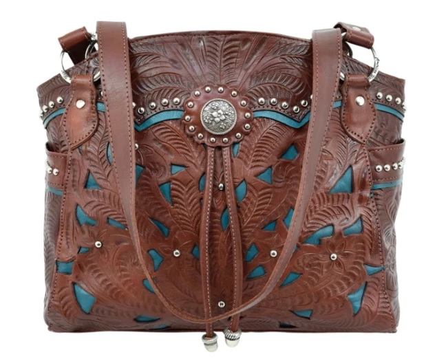 Lady Lace Collection: Zip top tote with zipper closure. Hand-tooled genuine leather with Turquoise leather inlay accents and silver spot designs, featuring a floral silver concho. Smooth leather back. Interior is 2 compartments divided by a zippered pocket and has an additional smaller zipper pocket. Exterior has slip pockets on both sides of bag. Each handbag includes a protective storage bag. Each piece is made by hand, one at a time.