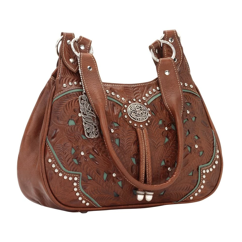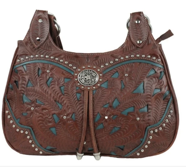 Lady Lace Collection: Three compartment zip-top scoop tote. Hand-tooled vegetable tanned Light Brown or Dark Brown genuine leather with Turquoise leather inlay accents and silver spot designs, featuring a floral silver concho. Smooth leather back. Inside has a middle zipper compartment between two large compartments and is covered with a zip-top flap for closure. Inside also has a zipper pocket and open pouches. Each handbag includes a silver signature keepsake and a protective storage bag. Each piece is made by hand, one at a time.