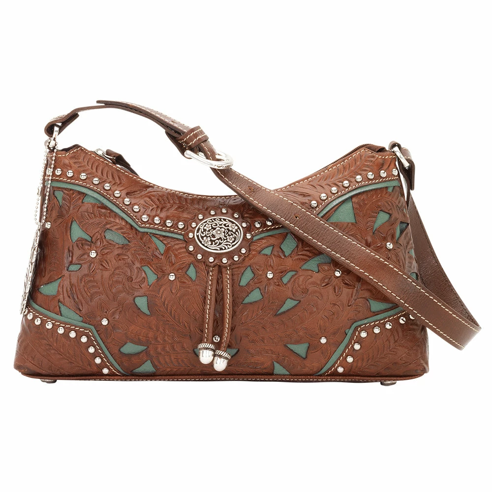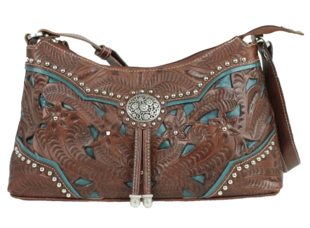 Lady Lace Collection: Zip top shoulder bag. Hand-tooled vegetable tanned Light Brown or Dark Brown genuine leather with Turquoise leather inlay accents and silver spot designs, featuring a floral silver concho. Hand tooled front and back.Each handbag includes a silver signature keepsake and a protective storage bag. Each piece is made by hand, one at a time.
