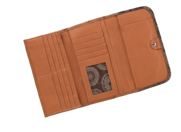 Lariats & Lace Collection: Made from beautifully hand tooled genuine leather, the Lariats & Lace wallet is the perfect match for your favorite handbag. This elegant and uncomplicated collection is accented with lacing details and an antiqued silver decorative concho. This popular tri-fold wallet includes a back zipper coin pocket, and the full leather interior includes 12 credit card spaces, 1 clear ID space, multiple currency pockets, and a checkbook flap.