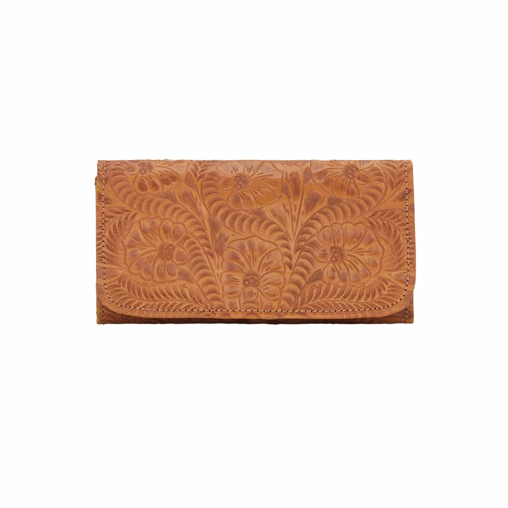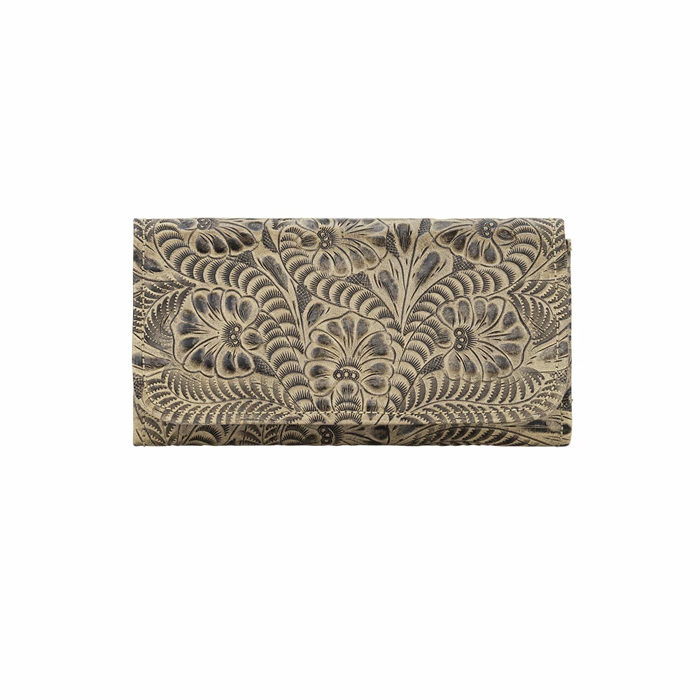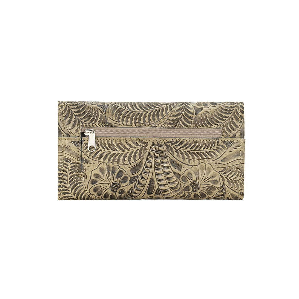 Santa Barbara Collection Tri-fold wallet with spring snap closure. Genuine leather is hand tooled on the full exterior. Full leather inside contains a flap for a checkbook, 13 card slots, and 5 compartments. Back has a zipper coin pocket. Each piece is made by hand, one at a time.