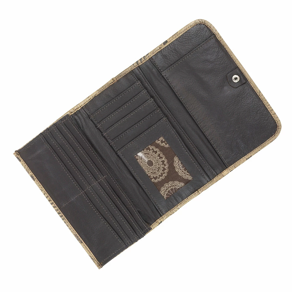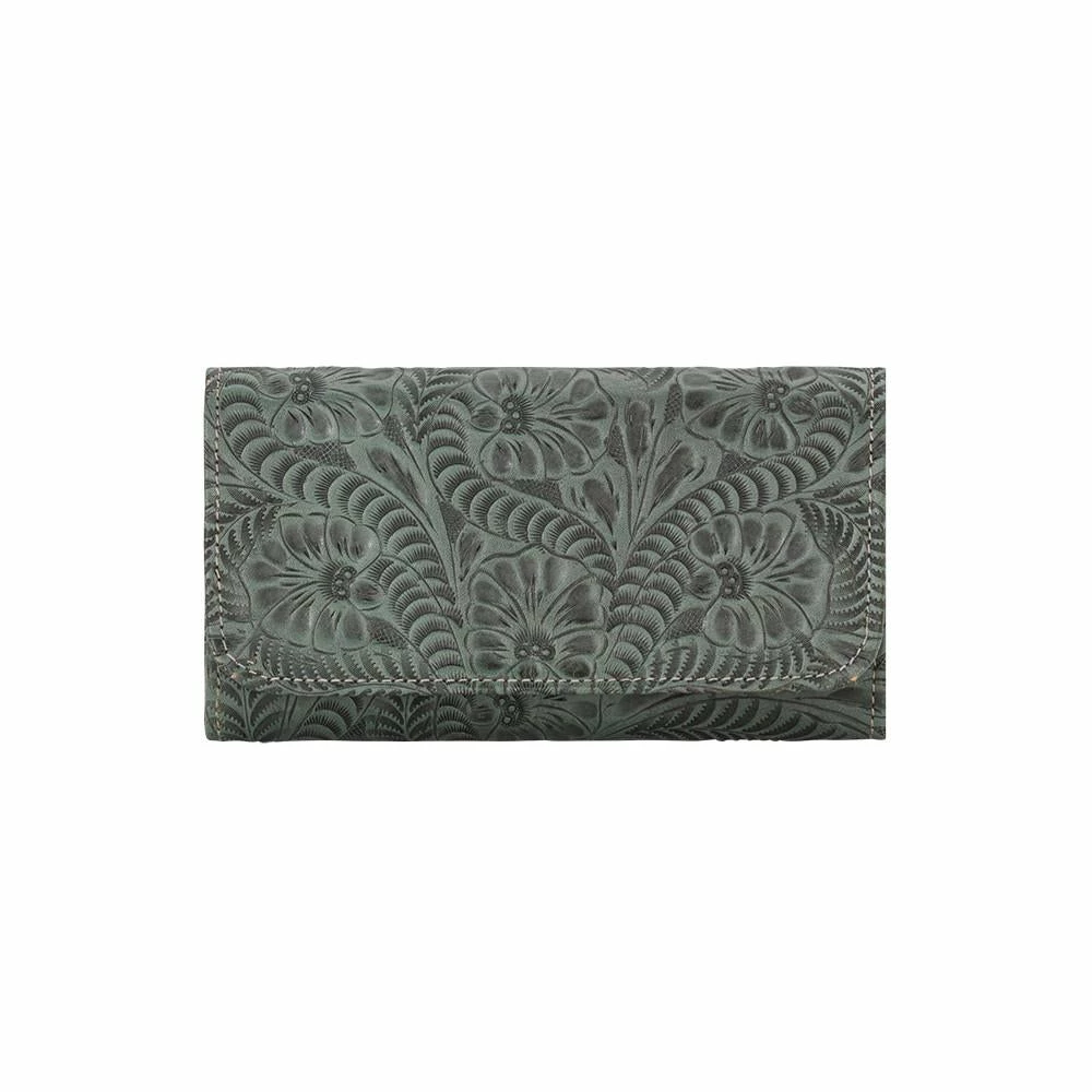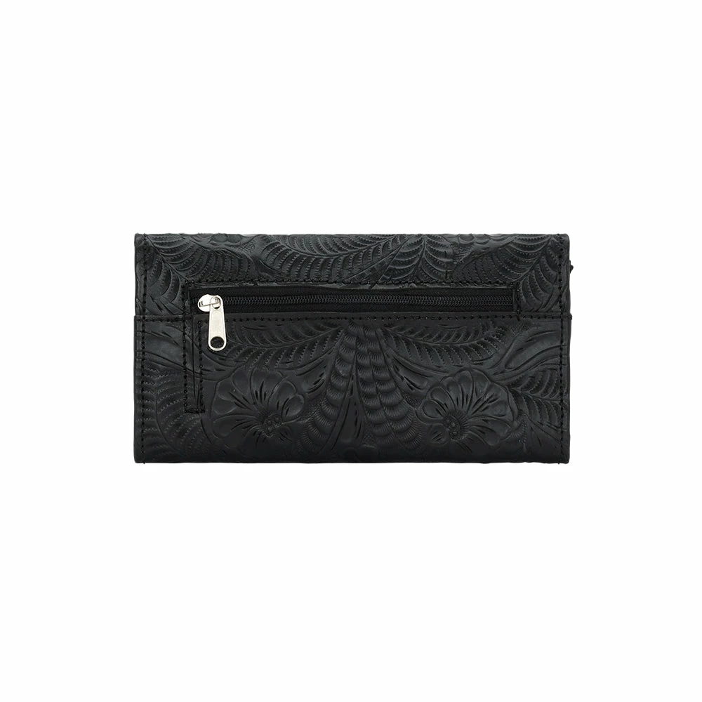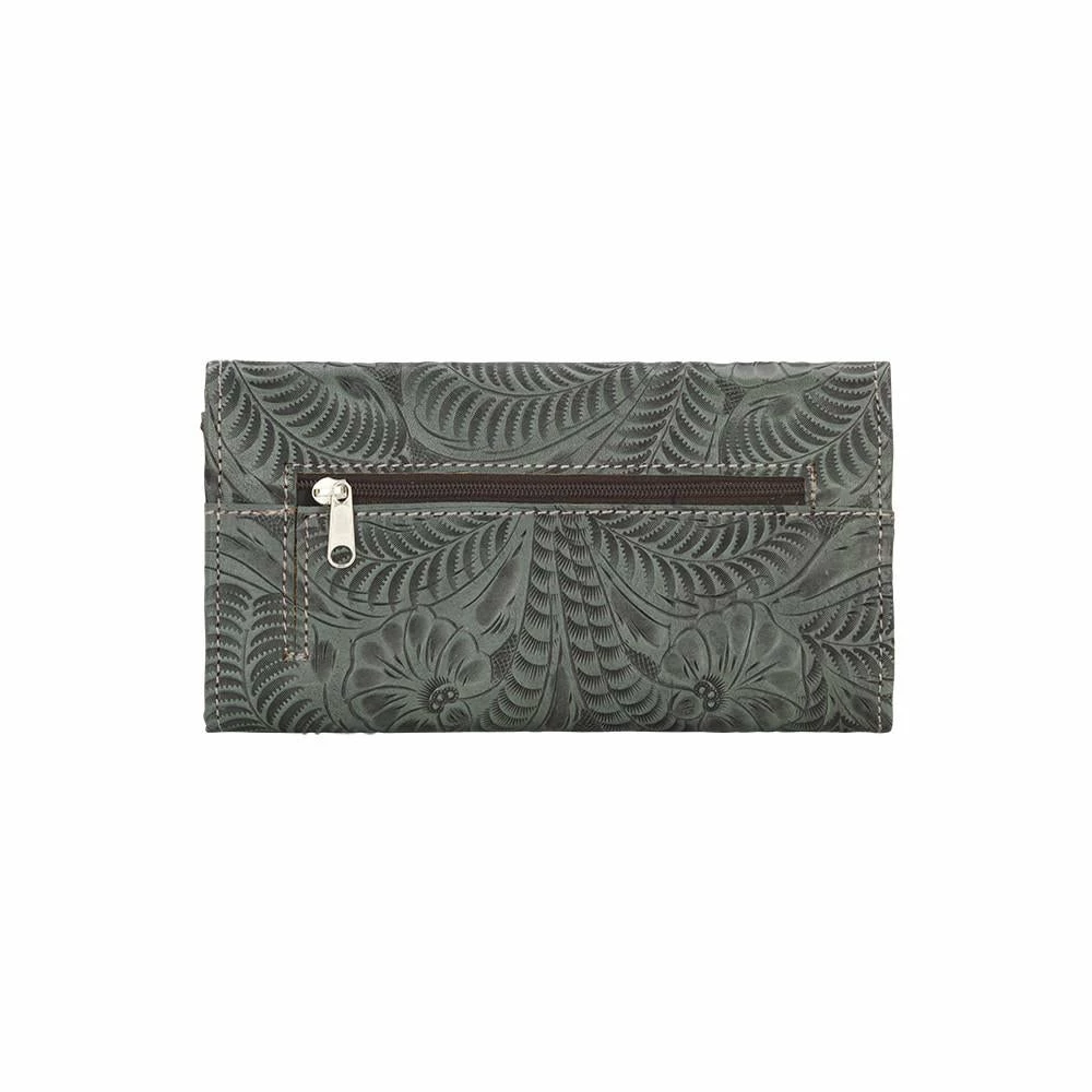 Santa Barbara Collection Tri-fold wallet with spring snap closure. Genuine leather is hand tooled on the full exterior. Full leather inside contains a flap for a checkbook, 13 card slots, and 5 compartments. Back has a zipper coin pocket. Each piece is made by hand, one at a time.