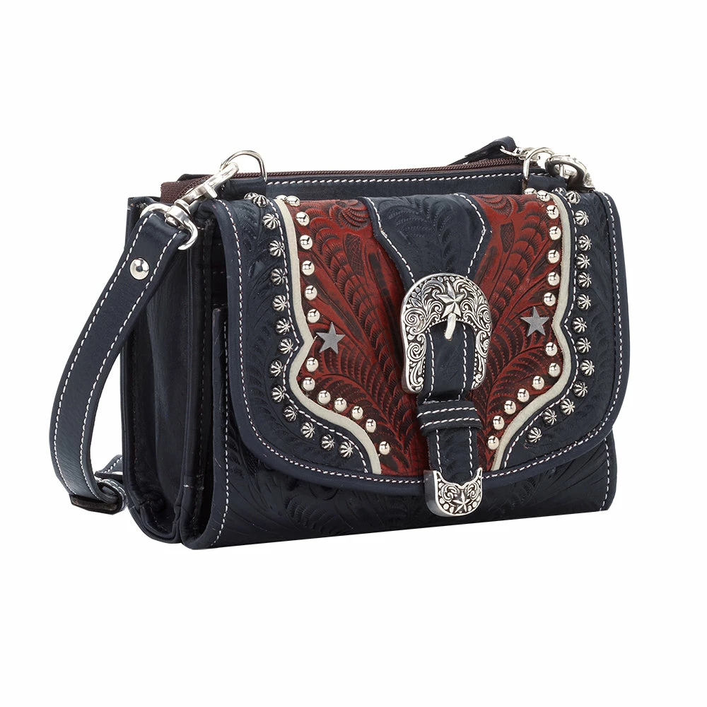 Small handbag and wallet combo with adjustable/detachable shoulder strap. Hand-tooled vegetable tanned Navy Blue genuine leather with Distressed Crimson inlay and Cream leather trim, accented with a 2-piece star buckle set, smooth silver spots, and stars. Main zipper compartment has a cell phone pouch, and back has a zipper pocket. Front flap opens to reveal 2 clear ID windows, 4 card slots, 2 open compartments, a zipper coin compartment, and a pen holder, all made of genuine leather. Each piece is made by hand, one at a time.