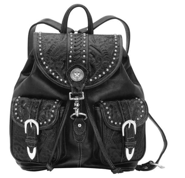 Retro Travel Collection: Handsome backpack with two front pockets, flap front, adjustable shoulder strap. Accented with silver tone studs and smooth buckles. 12 x 14 x 6.” Carry your essentials with stye and hands free. Each handbag includes a protective storage bag. Each piece is made by hand, one at a time.
