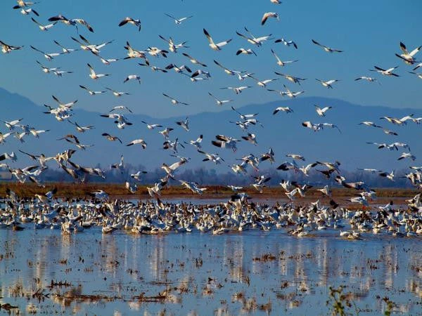 Snows feeding in the flooded rice fields.