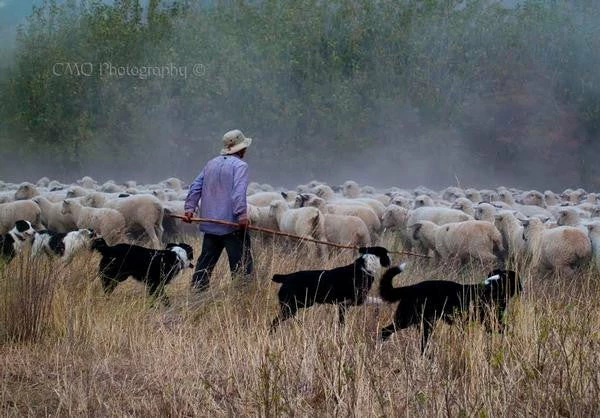 The Peruvian herder and his three border collies work together to bring the sheep to the corrals near Bear Creek in the Calamity National Forest, Idaho.