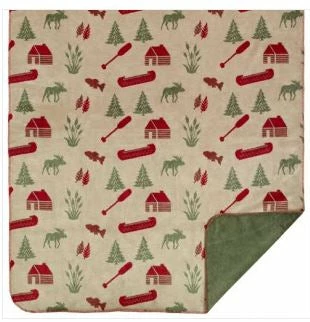 Retro design features everything you need at a lakeside camp – canoe, paddle, cabin, pine trees, moose and fish! Mix and match with other colors and patterns. Red and Green reverses to Sage, Taupe reverses to Black.
