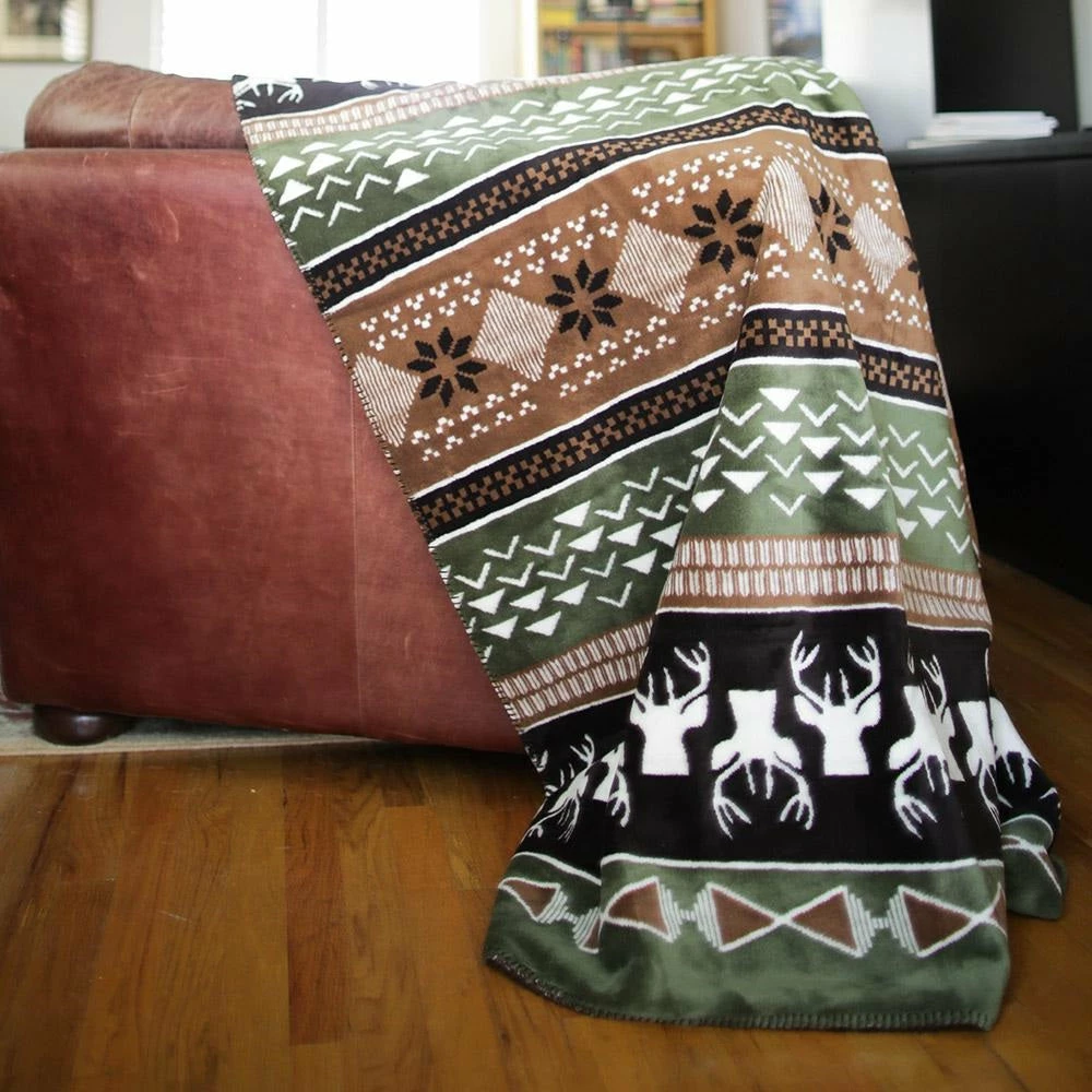 Nordic Deer blanket design. Let the geometric shapes and patterns of nature comfort you while you take an afternoon snooze. Colors cream, emerald, burnt ochre, and black reverses to black.