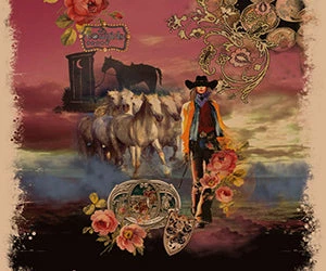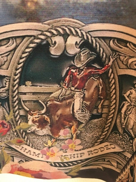 - Tunic length, Western print featuring iconic cowgirl, horses, and buckles