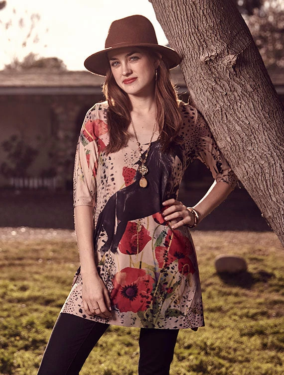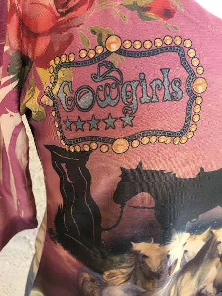 It’s all about the spirit of the cowgirl in this gorgeous rose colored print featuring an iconic cowgirl with her horse. Silver Cowgirl Tunic features horses, flowers and buckles throughout the design. Comfortable, ¾ sleeve with round neck, longer length. See the last 2 photos for this body style’s silhouette without the print and this style on a model in a different pattern.