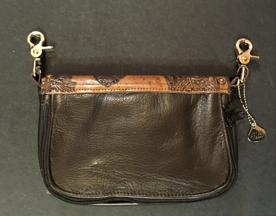 Handmade of soft, supple coffee bean cowhide leather accented with feather design on tan, oak leaf, and white washed gator. Antique copper studs rim the lid’s edge. Center copper concho accent. Ambidextrous draw rear zipped concealed carry pocket. Stunning, eye-catching and hard working, this bag holds your essentials and allows you to be hands free – attach to belt loops or attach strap for crossbody or waist wear.
