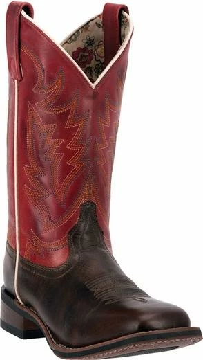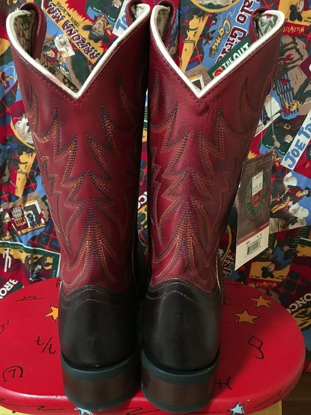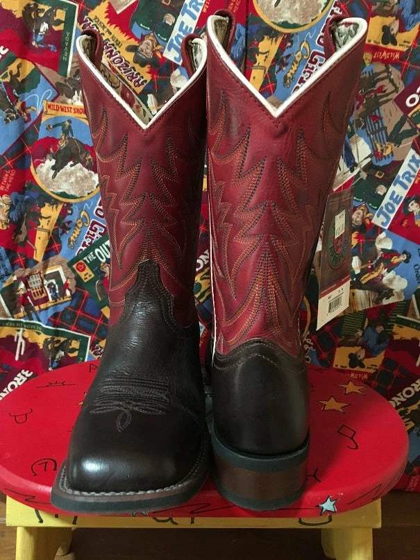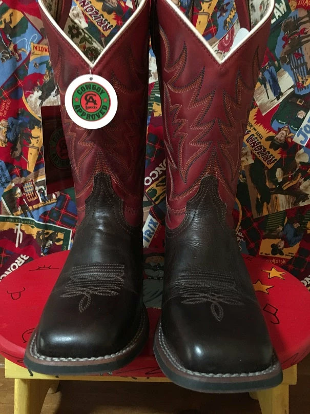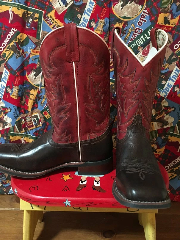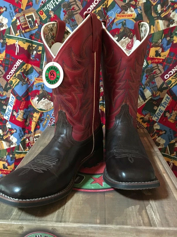 Classic Western Stockman style of Burnished Red Leather and Dark Brown Leather Foot. Stockman line with Cowboy Approved Outsole.