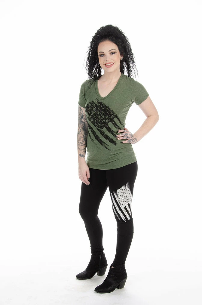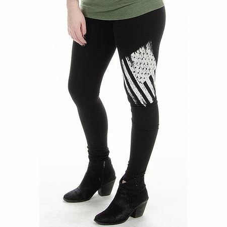 Liberty Wear Women’s, Justice, smoothing and figure flattering mid-rise basic black legging that has a no roll band and is see-through proof. Americn Flag design along the upper leg.