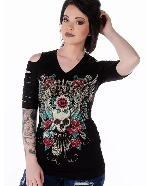 Devilish Cuts, edgy, cold shoulder, v-neck, half sleeve top with Devilish embellished skull graphic and sexy laser cut slash sleeves.