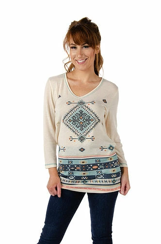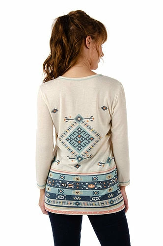 Front and back Aztec print sublimated, 3/4 sleeve, relax fit, modest, shallow v-neck, embellished with rhinestones on the front.