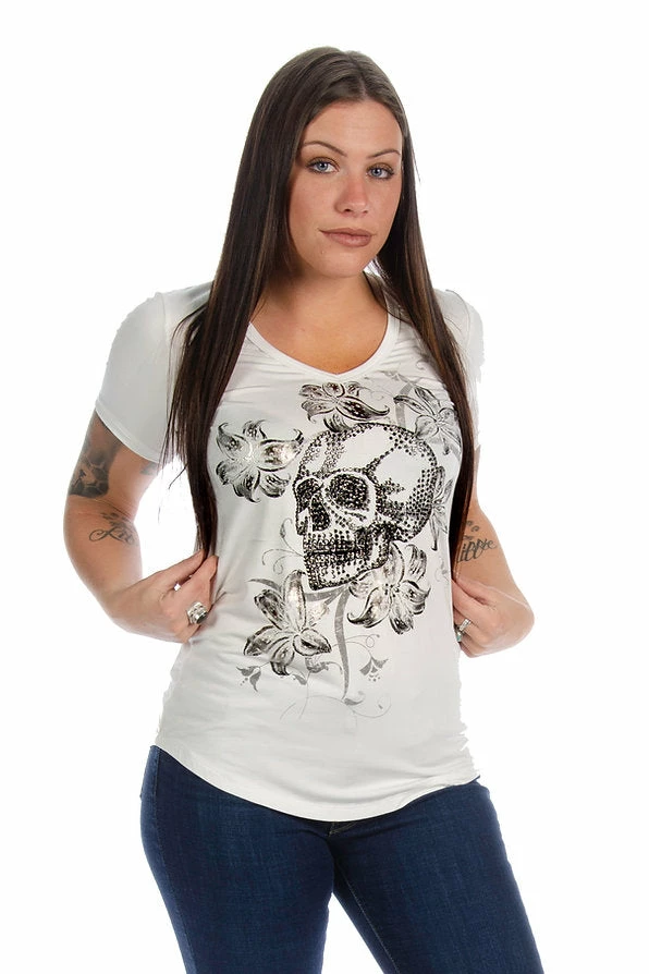 Liberty Wear Women, Lethal Lily, T-shirt is an easy fit, short sleeve v-neck with rhinestone and foil embellished skull and lilies.