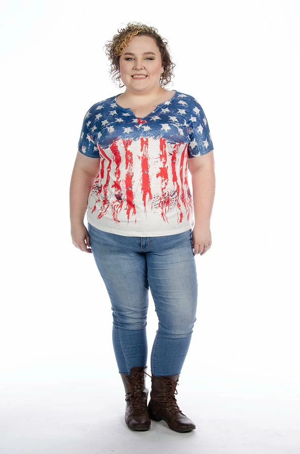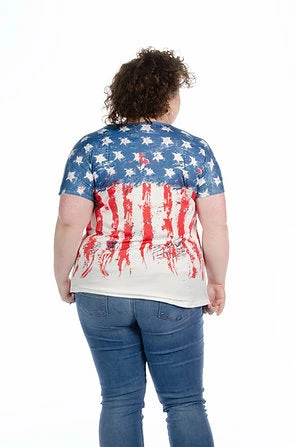 Women’s New Old Glory dolman short sleeve patriotic top is inspired by the American flag.