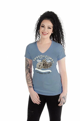 Liberty Wear for Ladies’, Speed & Power, is a short sleeve v-neck with rhinestone embellished speed and power graphic.