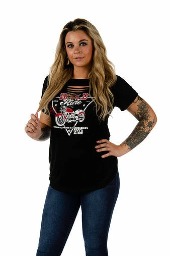 Liberty Wear’s, WYLD RIDE, features a motorcycle graphic short sleeve dolman with edgy center front bodice slits and embellished in rhinestones.