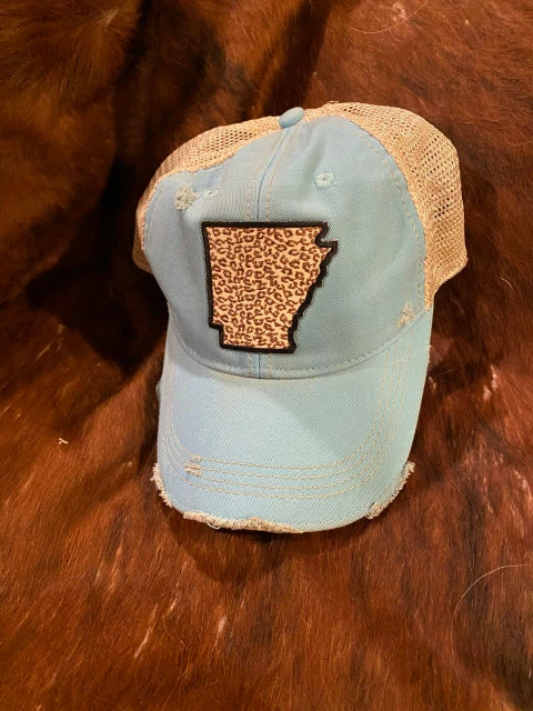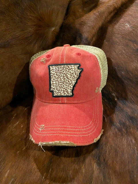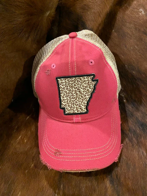 Great looking cap features the Great State of Arkansas with leopard print.