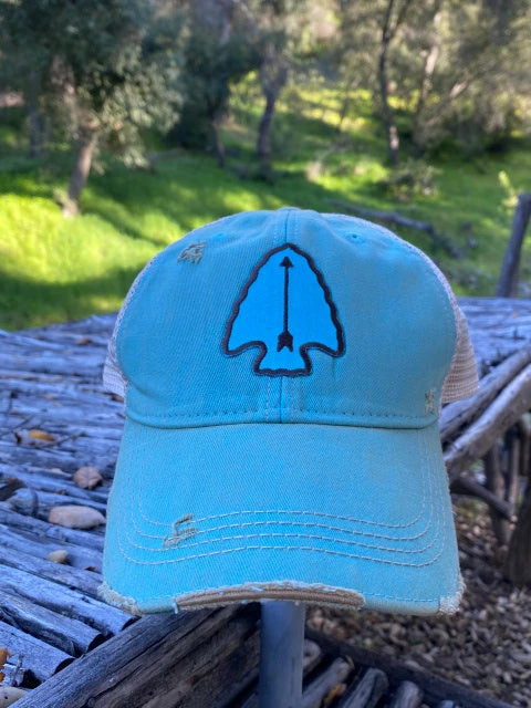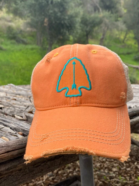 Tahoma Arrowhead: Vintage Turquoise and Bittersweet (orange) - Medium weight cotton 4 rows of contrasting stitching on front bill One Size Fits Most Plastic snap back adjustable closure